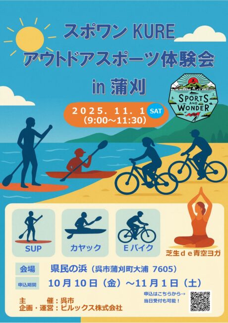 令和7年11月1日(土曜日)に,「スポワンKUREアウトドアスポーツ体験会in蒲刈」を開催します。